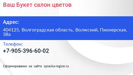 Ваш Букет, салон цветов по адресу 404125, Волгоградская область, Волжский, Пионерская, 38а в дальнейшем Организация, размещена в следующих категориях: