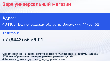 Заря, универсальный магазин по адресу 404105, Волгоградская область, Волжский, Мира, 62 в дальнейшем Организация, размещена в следующих категориях: