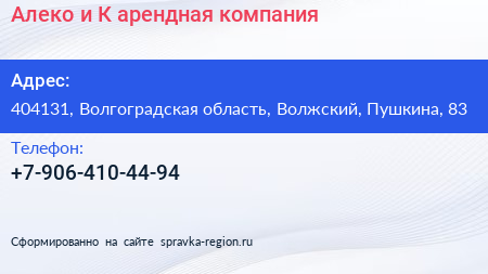 Алеко и К, арендная компания по адресу 404131, Волгоградская область, Волжский, Пушкина, 83 в дальнейшем Организация, размещена в следующих категориях: