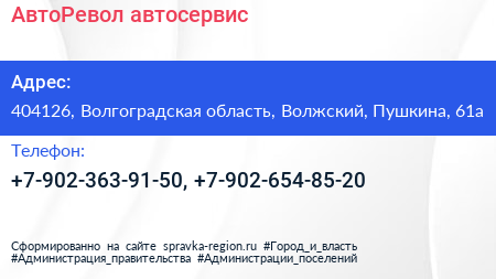 АвтоРевол, автосервис по адресу 404126, Волгоградская область, Волжский, Пушкина, 61а в дальнейшем Организация, размещена в следующих категориях: