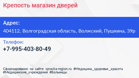 Крепость, магазин дверей по адресу 404112, Волгоградская область, Волжский, Пушкина, 39р в дальнейшем Организация, размещена в следующих категориях: