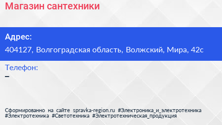 Магазин сантехники по адресу 404127, Волгоградская область, Волжский, Мира, 42с в дальнейшем Организация, размещена в следующих категориях: