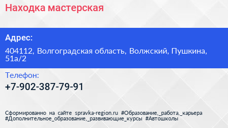 Находка, мастерская по адресу 404112, Волгоградская область, Волжский, Пушкина, 51а/2 в дальнейшем Организация, размещена в следующих категориях:
