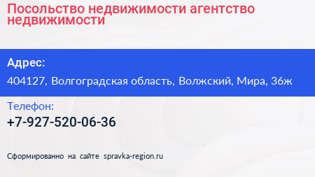 Посольство недвижимости, агентство недвижимости по адресу 404127, Волгоградская область, Волжский, Мира, 36ж в дальнейшем Организация, размещена в следующих категориях: