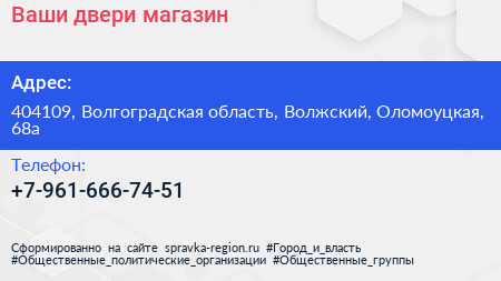 Ваши двери, магазин по адресу 404109, Волгоградская область, Волжский, Оломоуцкая, 68а в дальнейшем Организация, размещена в следующих категориях: