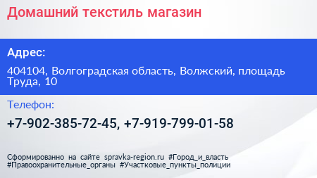 Домашний текстиль, магазин по адресу 404104, Волгоградская область, Волжский, площадь Труда, 10 в дальнейшем Организация, размещена в следующих категориях: