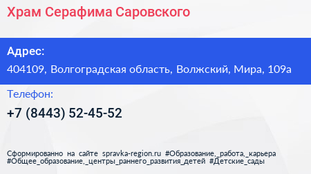 Храм Серафима Саровского по адресу 404109, Волгоградская область, Волжский, Мира, 109а в дальнейшем Организация, размещена в следующих категориях: