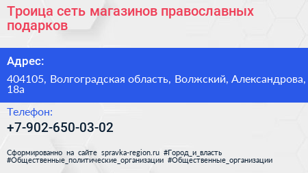 Троица, сеть магазинов православных подарков по адресу 404105, Волгоградская область, Волжский, Александрова, 18а в дальнейшем Организация, размещена в следующих категориях: