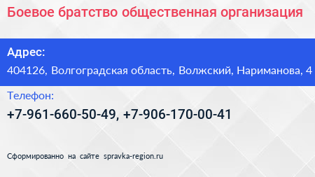 Боевое братство, общественная организация по адресу 404126, Волгоградская область, Волжский, Нариманова, 4 в дальнейшем Организация, размещена в следующих категориях: