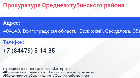 Прокуратура Среднеахтубинского района по адресу 404143, Волгоградская область, Волжский, Свердлова, 35а в дальнейшем Организация, размещена в следующих категориях: