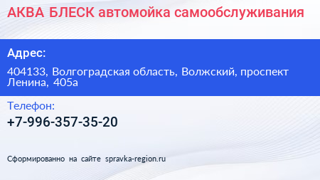 АКВА-БЛЕСК, автомойка самообслуживания по адресу 404133, Волгоградская область, Волжский, проспект Ленина, 405а в дальнейшем Организация, размещена в следующих категориях: