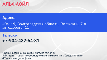 АЛЬФАОЙЛ по адресу 404119, Волгоградская область, Волжский, 7-я автодорога, 11 в дальнейшем Организация, размещена в следующих категориях: