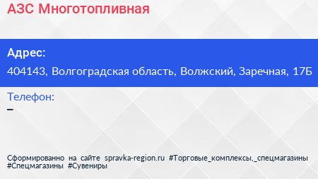 АЗС Многотопливная по адресу 404143, Волгоградская область, Волжский, Заречная, 17Б в дальнейшем Организация, размещена в следующих категориях: