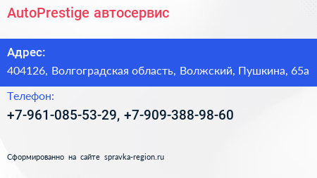 AutoPrestige, автосервис по адресу 404126, Волгоградская область, Волжский, Пушкина, 65а в дальнейшем Организация, размещена в следующих категориях: