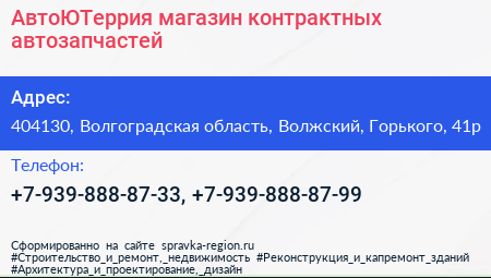 АвтоЮТеррия, магазин контрактных автозапчастей по адресу 404130, Волгоградская область, Волжский, Горького, 41р в дальнейшем Организация, размещена в следующих категориях: