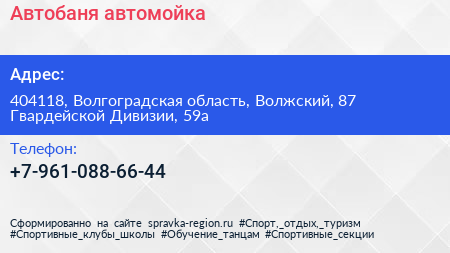 Автобаня, автомойка по адресу 404118, Волгоградская область, Волжский, 87 Гвардейской Дивизии, 59а в дальнейшем Организация, размещена в следующих категориях: