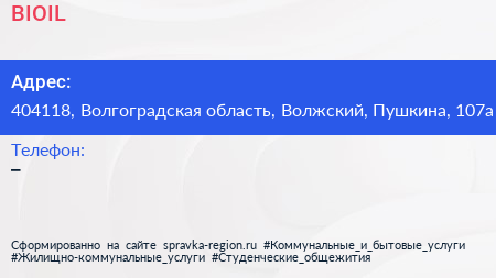 BIOIL по адресу 404118, Волгоградская область, Волжский, Пушкина, 107а в дальнейшем Организация, размещена в следующих категориях:
