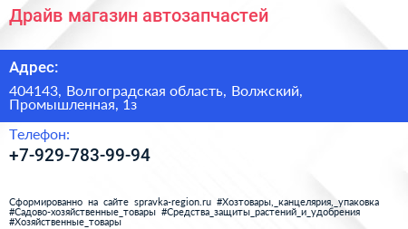 Драйв, магазин автозапчастей по адресу 404143, Волгоградская область, Волжский, Промышленная, 1з в дальнейшем Организация, размещена в следующих категориях: