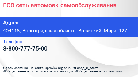 ECO, сеть автомоек самообслуживания по адресу 404118, Волгоградская область, Волжский, Мира, 127 в дальнейшем Организация, размещена в следующих категориях:
