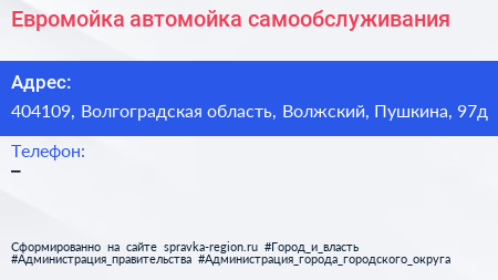 Евромойка, автомойка самообслуживания по адресу 404109, Волгоградская область, Волжский, Пушкина, 97д в дальнейшем Организация, размещена в следующих категориях: