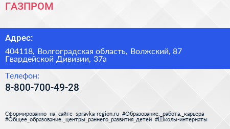 ГАЗПРОМ по адресу 404118, Волгоградская область, Волжский, 87 Гвардейской Дивизии, 37а в дальнейшем Организация, размещена в следующих категориях:
