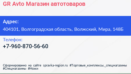 GR.Avto, Магазин автотоваров по адресу 404101, Волгоградская область, Волжский, Мира, 148Б в дальнейшем Организация, размещена в следующих категориях:
