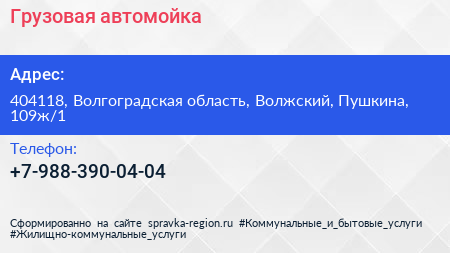 Грузовая автомойка по адресу 404118, Волгоградская область, Волжский, Пушкина, 109ж/1 в дальнейшем Организация, размещена в следующих категориях: