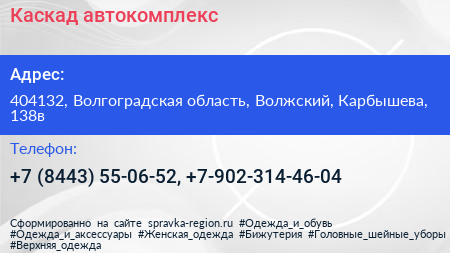 Каскад, автокомплекс по адресу 404132, Волгоградская область, Волжский, Карбышева, 138в в дальнейшем Организация, размещена в следующих категориях: