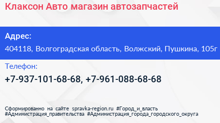 Клаксон-Авто, магазин автозапчастей по адресу 404118, Волгоградская область, Волжский, Пушкина, 105г в дальнейшем Организация, размещена в следующих категориях: