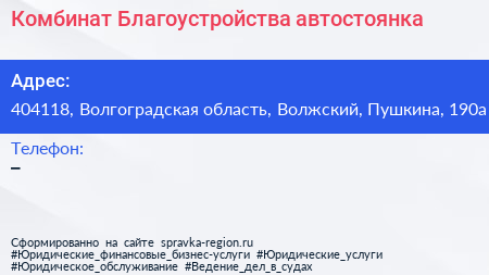 Комбинат Благоустройства, автостоянка по адресу 404118, Волгоградская область, Волжский, Пушкина, 190а в дальнейшем Организация, размещена в следующих категориях: