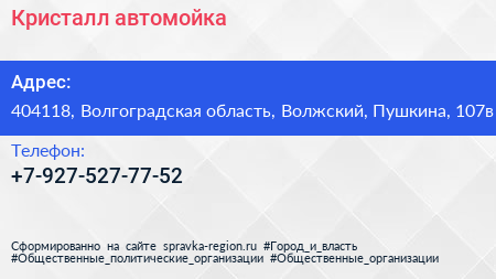 Кристалл, автомойка по адресу 404118, Волгоградская область, Волжский, Пушкина, 107в в дальнейшем Организация, размещена в следующих категориях: