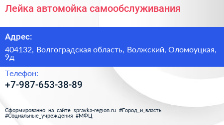 Лейка, автомойка самообслуживания по адресу 404132, Волгоградская область, Волжский, Оломоуцкая, 9д в дальнейшем Организация, размещена в следующих категориях: