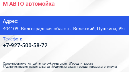 М-АВТО, автомойка по адресу 404109, Волгоградская область, Волжский, Пушкина, 95г в дальнейшем Организация, размещена в следующих категориях: