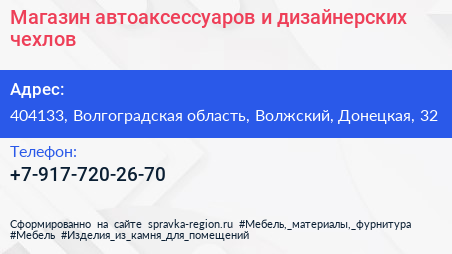 Магазин автоаксессуаров и дизайнерских чехлов по адресу 404133, Волгоградская область, Волжский, Донецкая, 32 в дальнейшем Организация, размещена в следующих категориях: