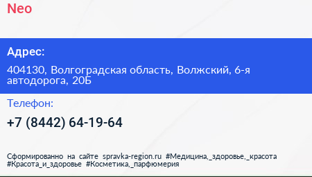 Neo по адресу 404130, Волгоградская область, Волжский, 6-я автодорога, 20Б в дальнейшем Организация, размещена в следующих категориях: