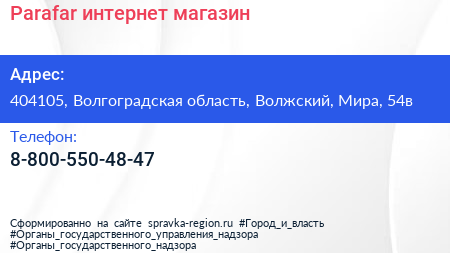 Parafar, интернет-магазин по адресу 404105, Волгоградская область, Волжский, Мира, 54в в дальнейшем Организация, размещена в следующих категориях: