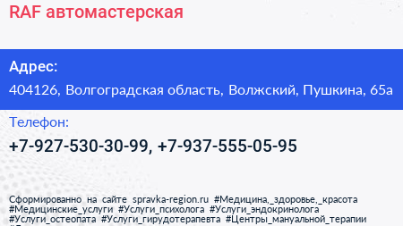 RAF, автомастерская по адресу 404126, Волгоградская область, Волжский, Пушкина, 65а в дальнейшем Организация, размещена в следующих категориях: