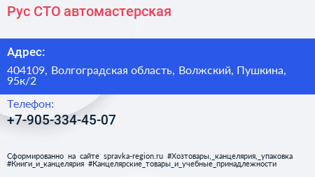 Рус-СТО, автомастерская по адресу 404109, Волгоградская область, Волжский, Пушкина, 95к/2 в дальнейшем Организация, размещена в следующих категориях: