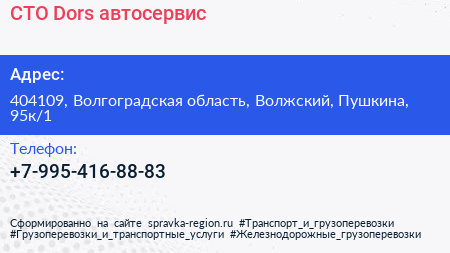 СТО Dors, автосервис по адресу 404109, Волгоградская область, Волжский, Пушкина, 95к/1 в дальнейшем Организация, размещена в следующих категориях: