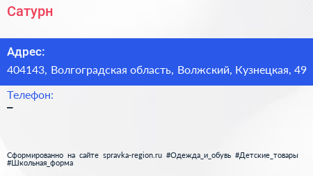 Сатурн по адресу 404143, Волгоградская область, Волжский, Кузнецкая, 49 в дальнейшем Организация, размещена в следующих категориях: