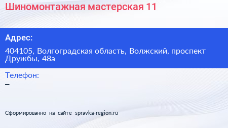 Шиномонтажная мастерская №11 по адресу 404105, Волгоградская область, Волжский, проспект Дружбы, 48а в дальнейшем Организация, размещена в следующих категориях: