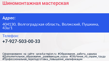 Шиномонтажная мастерская по адресу 404130, Волгоградская область, Волжский, Пушкина, 43а/1 в дальнейшем Организация, размещена в следующих категориях:
