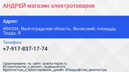 АНДРЕЙ, магазин электротоваров по адресу 404104, Волгоградская область, Волжский, площадь Труда, 8 в дальнейшем Организация, размещена в следующих категориях: