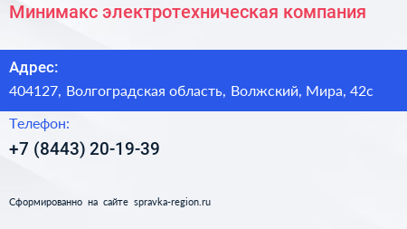 Минимакс, электротехническая компания по адресу 404127, Волгоградская область, Волжский, Мира, 42с в дальнейшем Организация, размещена в следующих категориях: