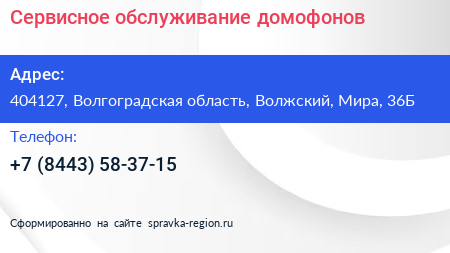 Сервисное обслуживание домофонов по адресу 404127, Волгоградская область, Волжский, Мира, 36Б в дальнейшем Организация, размещена в следующих категориях: