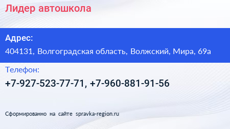 Лидер, автошкола по адресу 404131, Волгоградская область, Волжский, Мира, 69а в дальнейшем Организация, размещена в следующих категориях:
