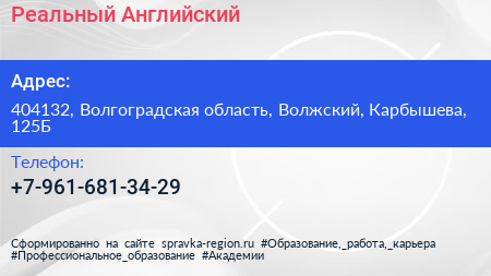 Реальный Английский по адресу 404132, Волгоградская область, Волжский, Карбышева, 125Б в дальнейшем Организация, размещена в следующих категориях: