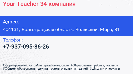 Your Teacher 34, компания по адресу 404131, Волгоградская область, Волжский, Мира, 81 в дальнейшем Организация, размещена в следующих категориях: