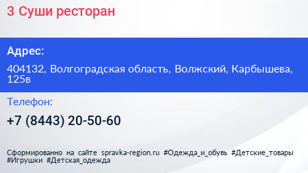 3 Суши, ресторан по адресу 404132, Волгоградская область, Волжский, Карбышева, 125в в дальнейшем Организация, размещена в следующих категориях: