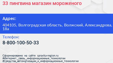 33 пингвина, магазин мороженого по адресу 404105, Волгоградская область, Волжский, Александрова, 18а в дальнейшем Организация, размещена в следующих категориях:
